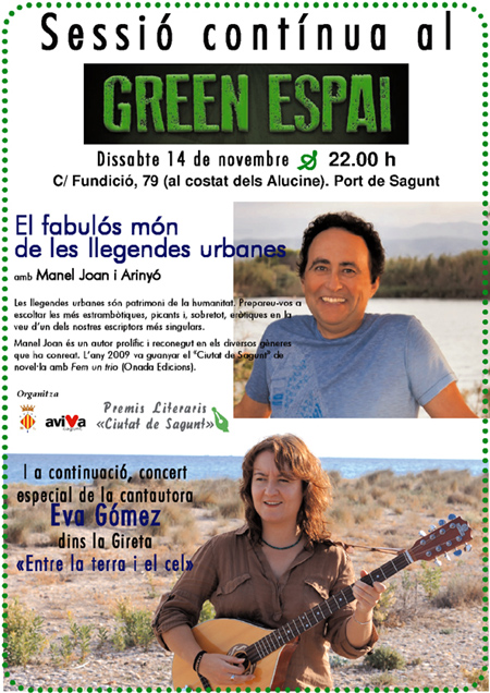 Por primer año, en el Green Espai del Puerto de Sagunt tendrá lugar una sesión continua con el novelista y contador de historias Manel Joan i Arinyó, que nos sorprenderá y nos hará reír con una charla desenfadada sobre «El fabulós món de les llegendes urbanes». A continuación, la cantautora Eva Gómez, acompañada por Laura Miñarro, ofrecerán un concierto especial dentro de su gira "Entre la terra i el cel".