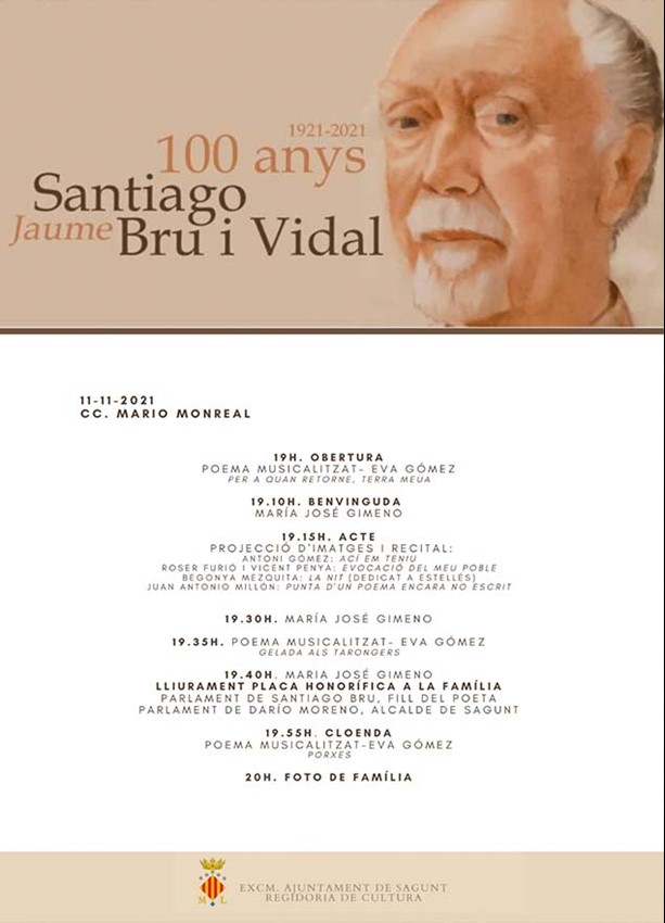 Dijous que ve, 11 de novembre, donaran principi les activitats i actes programats que s'han organitzat des de l'Ajuntament de Sagunt per honrar la memòria del cronista, historiador i poeta Santiago/Jaume Bru i Vidal l'any del centenari del seu naixement. Este dijous, coincidint amb l'aniversari de la seua defunció, es realitzarà un acte commemoratiu en el Centre Cultural Mario Monreal a les 19.00 hores, on es recordarà la seua persona i es recitaran els seus poemes.